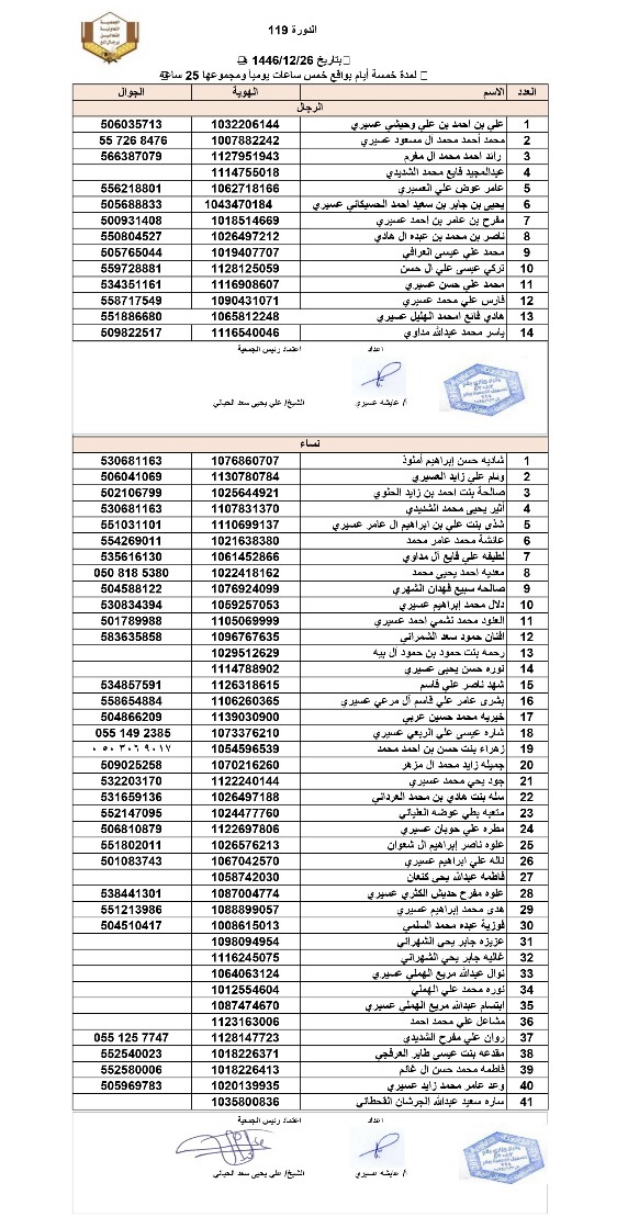 تحت إشراف فرع وزارة البيئة والمياه والزراعة بمنطقة عسير تقيم الجمعية التعاونية للنحالين برجال المع دورات تدريبية في اساسيات تربية النحل بتاريخ 26/ 12 رقم الدورة 119 |
