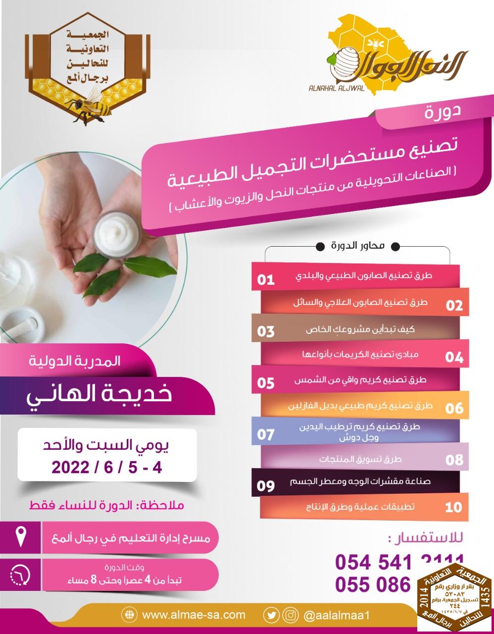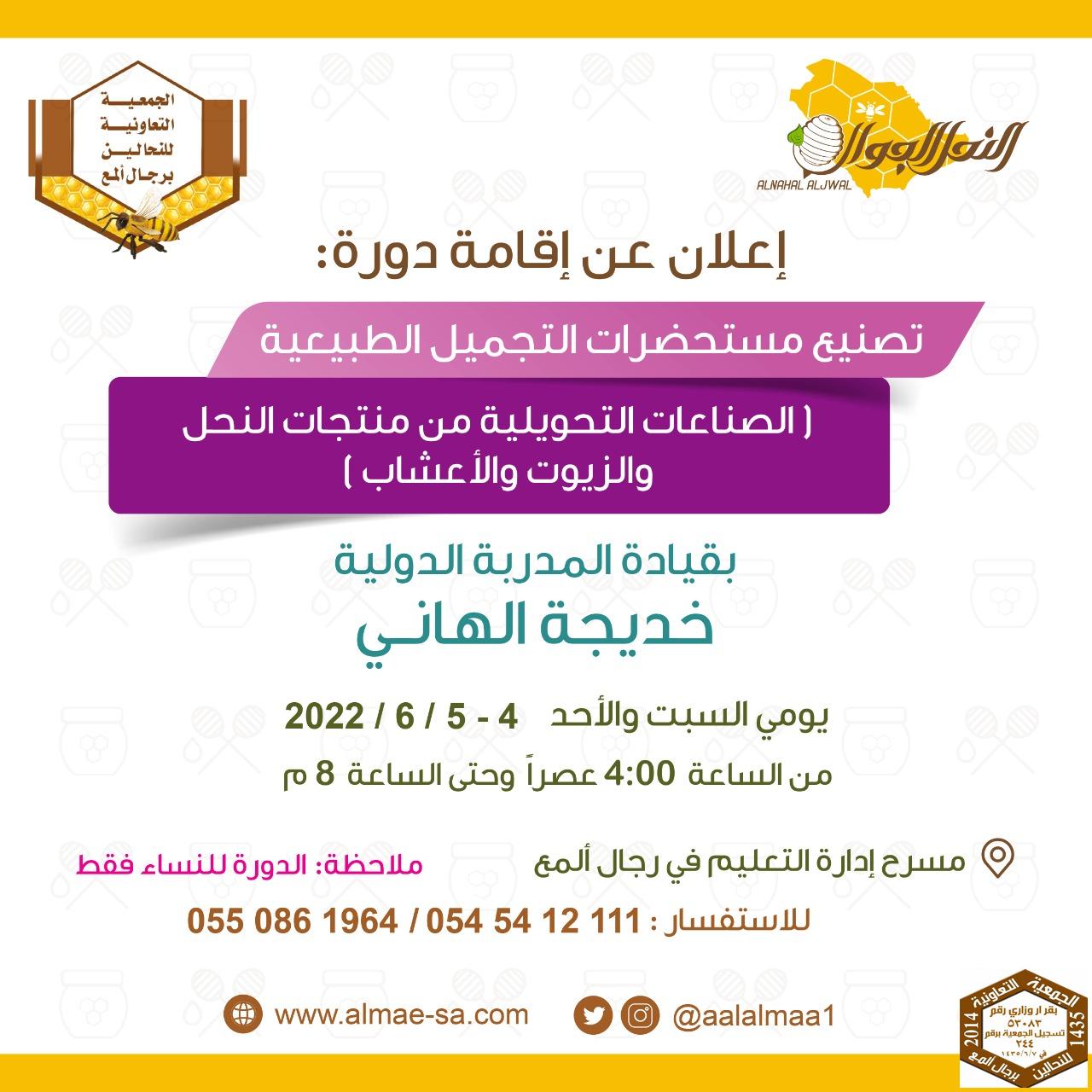 قامت جمعية النحالين التعاونية برجال ألمع بتدريب 37 متدربة من محافظة رجال المع من مختلف الأعمار بتدريب بمعدل ( 8 ) ساعات على مدة يومان , حيث منح كل متدربة شهادة حضور , تم تعليمهم على تصنيع مستحضرات التجميل الطبيعية والصناعات التحويلية من منتجات النحل والزيوت والأعشاب ( المراهم والشامبوهات والشمعدانات والصابون) التي تعتمد في تصنيعها على العسل وشمع النحل فقد تقرر تدريب لهم ,لفتح مجال لهم في العمل ، حيث تم عقدها في موقع مهيأ بمسرح التعليم لاحتوائه على جميع وسائل التقنية والسلامة بعد أخذ الإذن منهم , حيث سبق و تم عمل دورات نسائية عن بعد عن طريق برنامج الزوم نظرا للجائحة التي مرت بها البلد ففي حينها تم عقد دورتان حيث كان عناوين الدورات (عسل النحل والتصنيع الغذائي ـ الصناعات التحويلية للعسل وأدوات التجميل) حيث كان لها الأثر الكبير والواضح والملموس في حين وقتها تم الظغط على المتدربات بأن كل متدربة لم تحصل على شهادتها إلا بتقديم عمل من ما تم فهمه في الدورة المقدمة التي أخذتها؛ مما أجبرنا أن نعمل هذه الدورة في الوقت الحالي نظرا لكثرة الضغط الحاصل علينا والإقبال الكبير والقوي وحٌـب الممارسة والتعلم